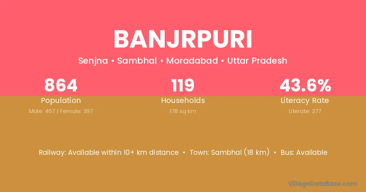 Sambhal (18 km) is the nearest town to Banjrpuri village for major economic activities and is located approximately 18 km away.