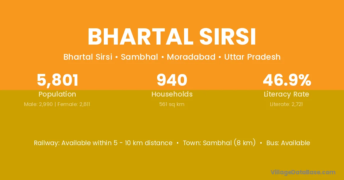 Sambhal (8 km) is the nearest town to Bhartal Sirsi village for major economic activities and is located approximately 8 km away.