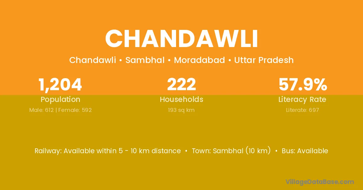 Chandawli village has a total population of 1,204 people, of which 612 are males and 592 are females.