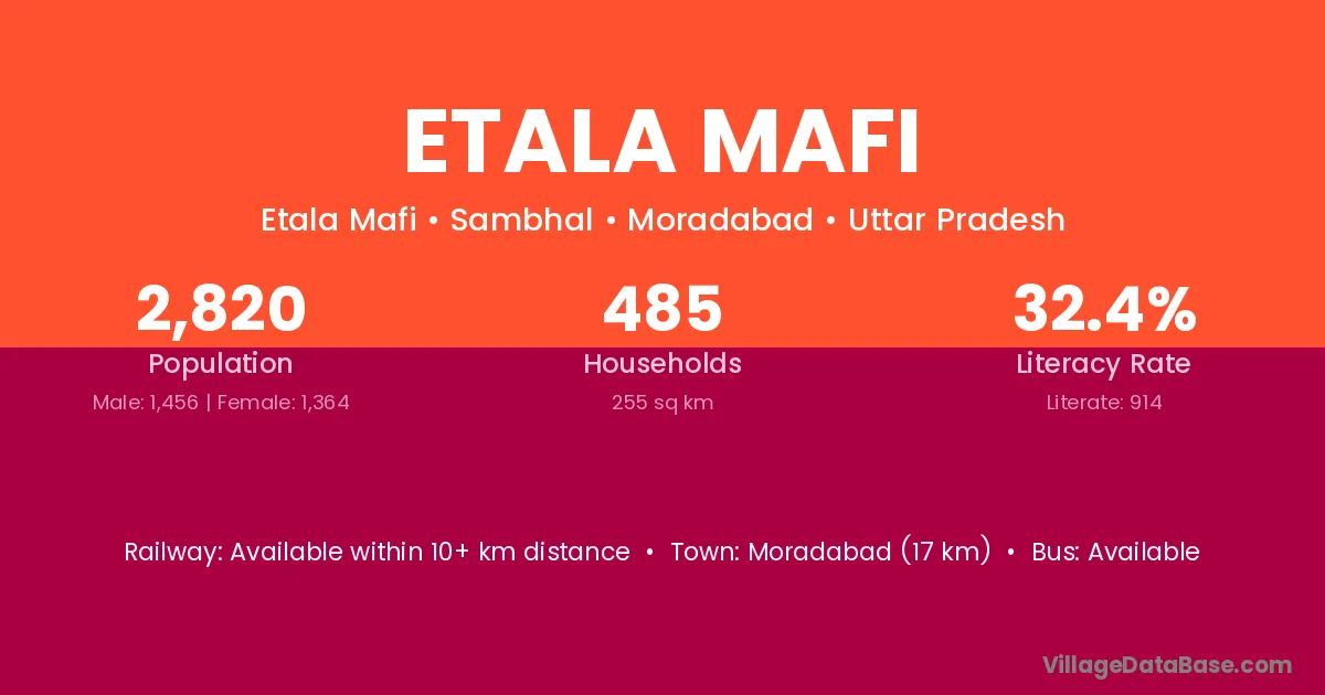 Moradabad (17 km) is the nearest town to Etala Mafi village for major economic activities and is located approximately 17 km away.