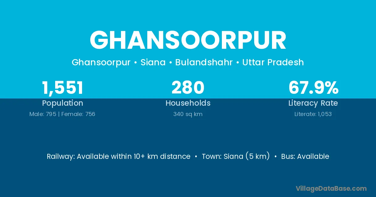 Sambhal (28 km) is the nearest town to Ghansoorpur village for major economic activities and is located approximately 28 km away.