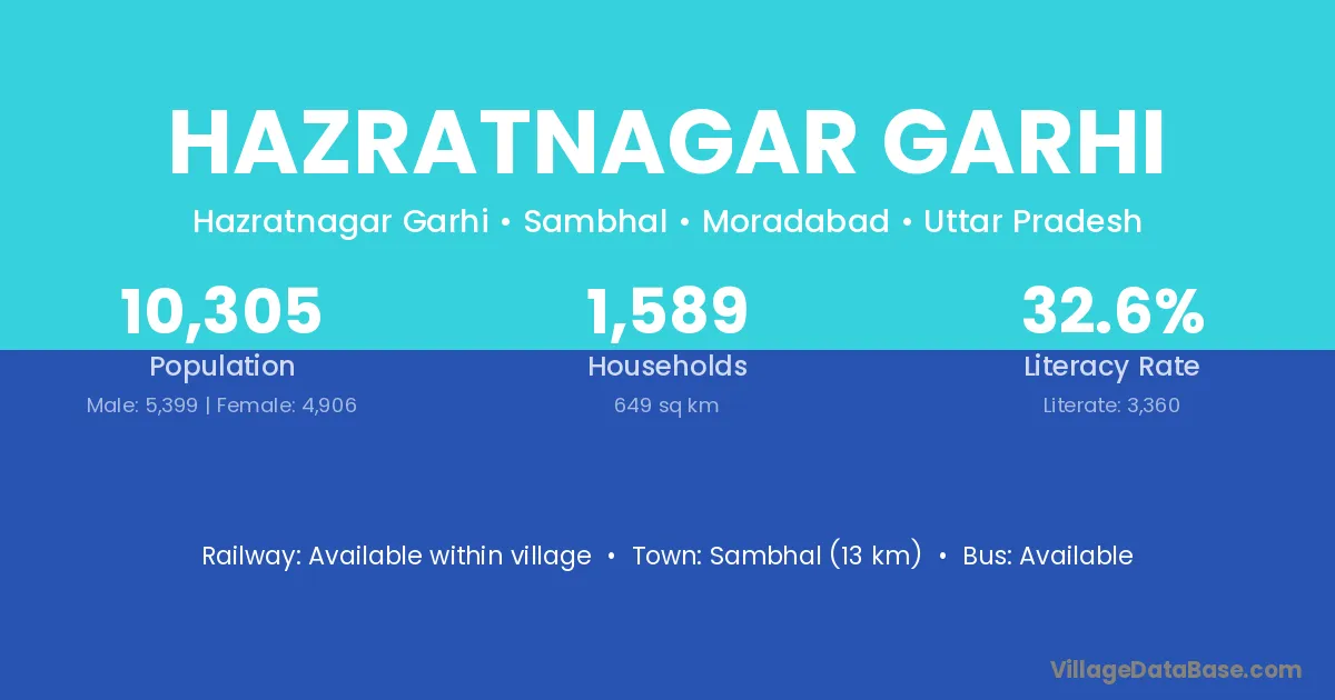 Sambhal (13 km) is the nearest town to Hazratnagar Garhi village for major economic activities and is located approximately 13 km away.