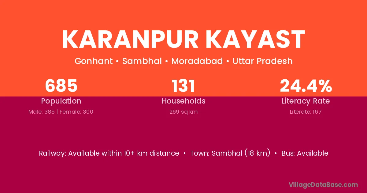 Sambhal (18 km) is the nearest town to Karanpur Kayast village for major economic activities and is located approximately 18 km away.
