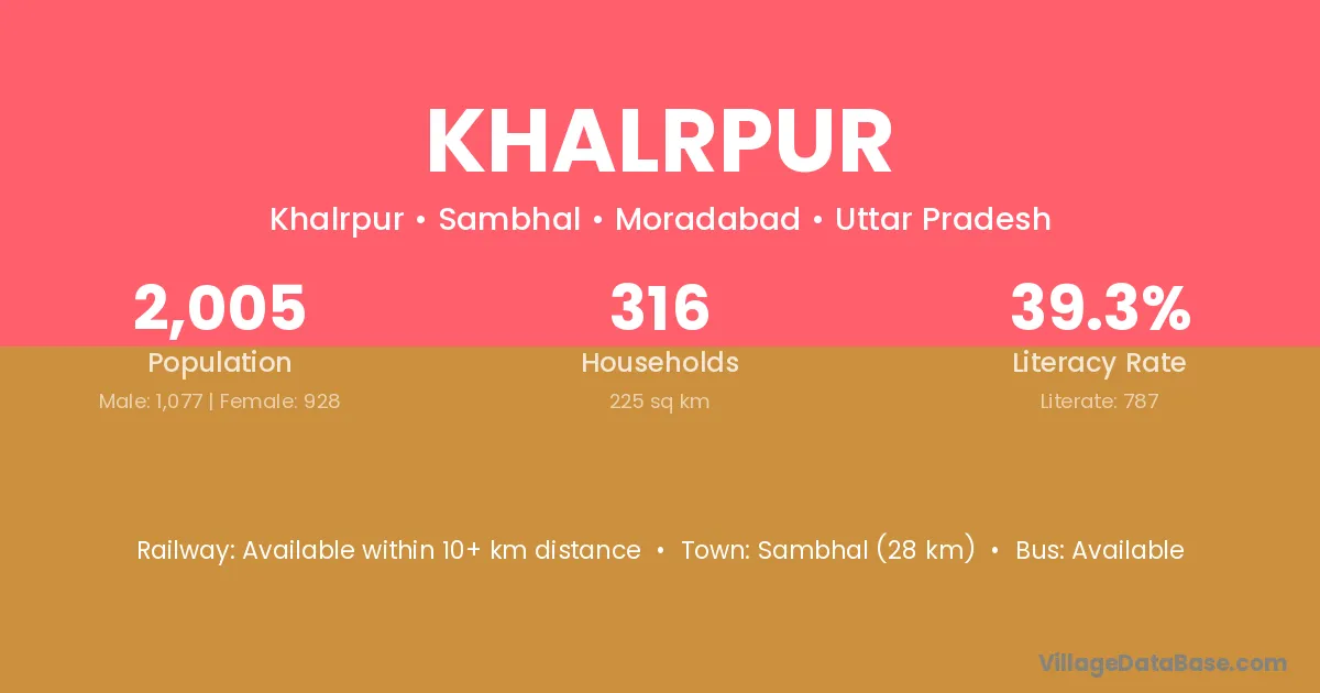 Sambhal (28 km) is the nearest town to Khalrpur village for major economic activities and is located approximately 28 km away.