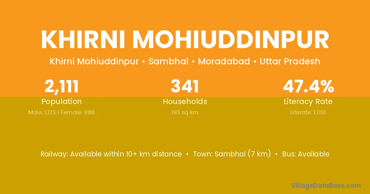 Sambhal (7 km) is the nearest town to Khirni Mohiuddinpur village for major economic activities and is located approximately 7 km away.