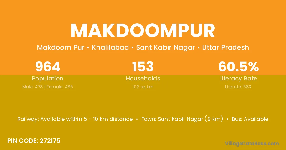 Makdoompur village has a total population of 965 people, of which 505 are males and 460 are females.