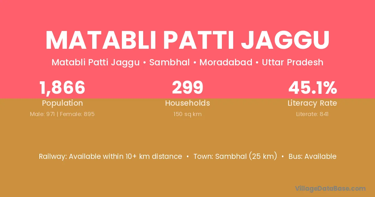 Sambhal (25 km) is the nearest town to Matabli Patti Jaggu village for major economic activities and is located approximately 25 km away.