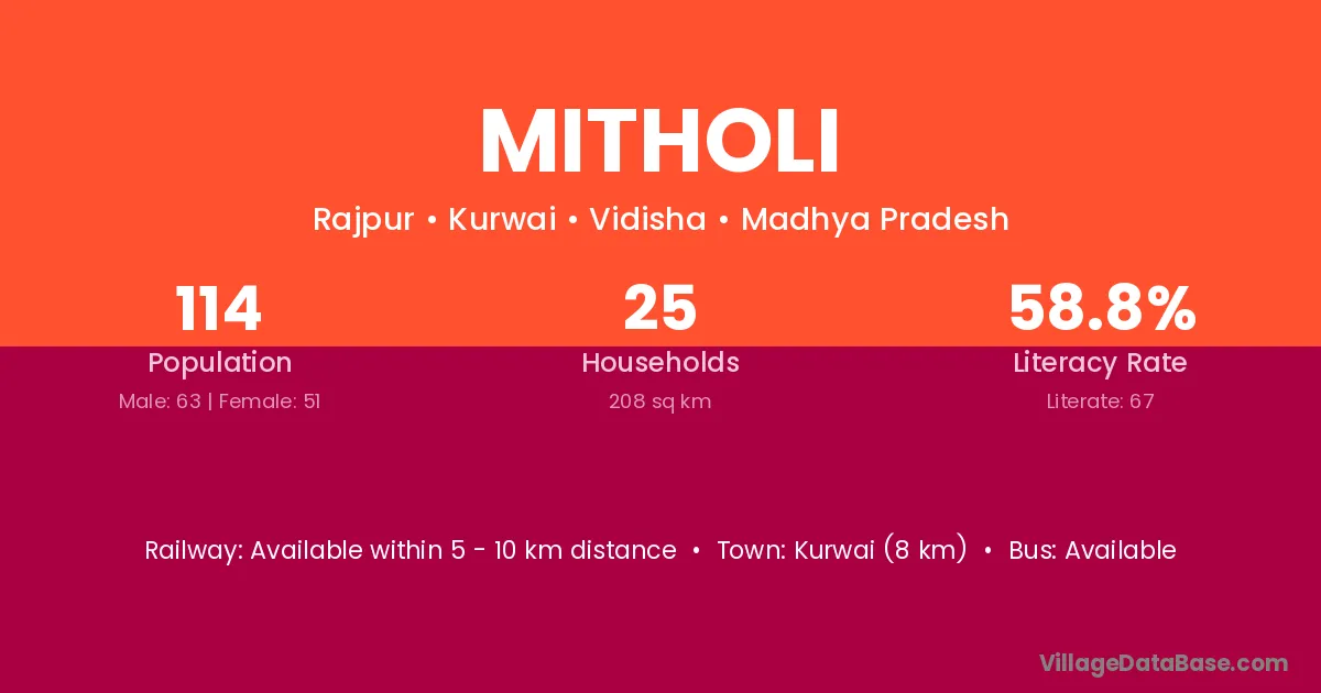 The literacy rate of Mitholi village is 32.14%. Male literacy stands at 39.37% and female literacy at 24.11%.