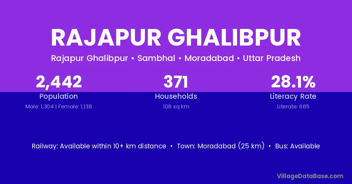 Moradabad (25 km) is the nearest town to Rajapur Ghalibpur village for major economic activities and is located approximately 25 km away.