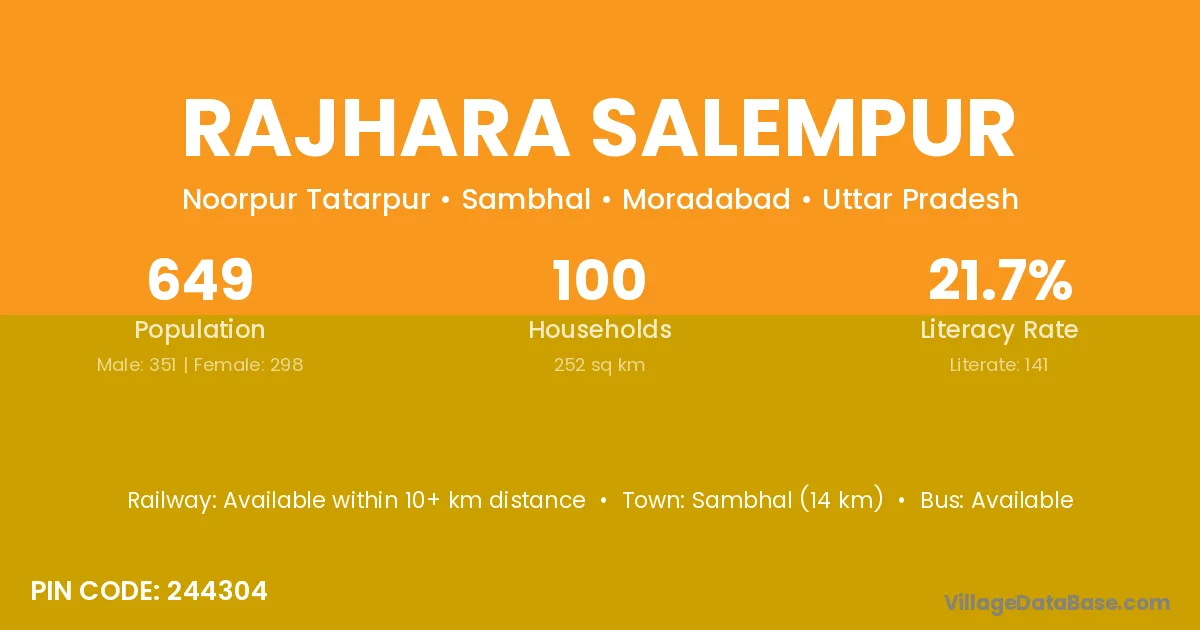 Sambhal (14 km) is the nearest town to Rajhara Salempur village for major economic activities and is located approximately 14 km away.