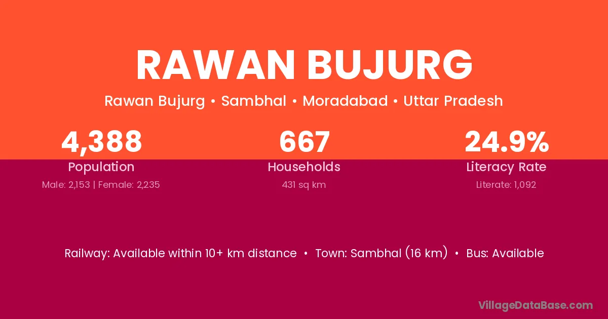 Sambhal (16 km) is the nearest town to Rawan Bujurg village for major economic activities and is located approximately 16 km away.