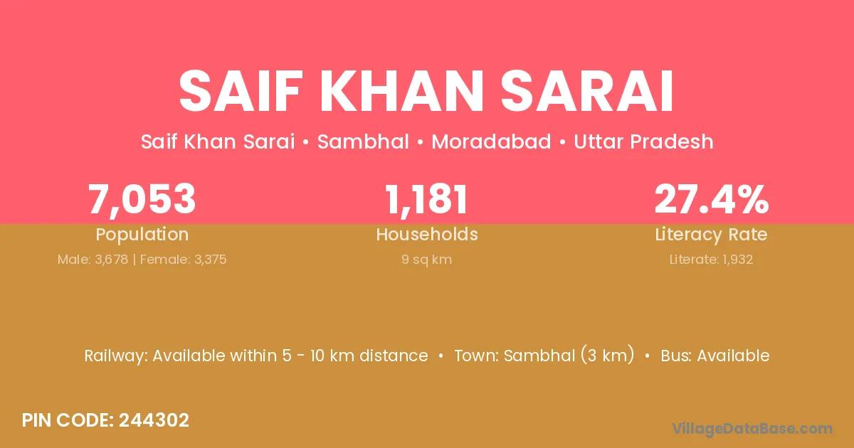 Sambhal (3 km) is the nearest town to Saif Khan Sarai village for major economic activities and is located approximately 3 km away.