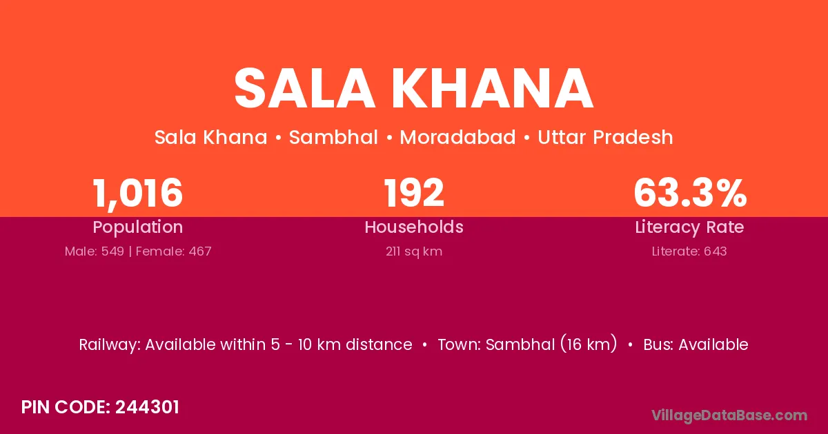 Sambhal (16 km) is the nearest town to Sala Khana village for major economic activities and is located approximately 16 km away.