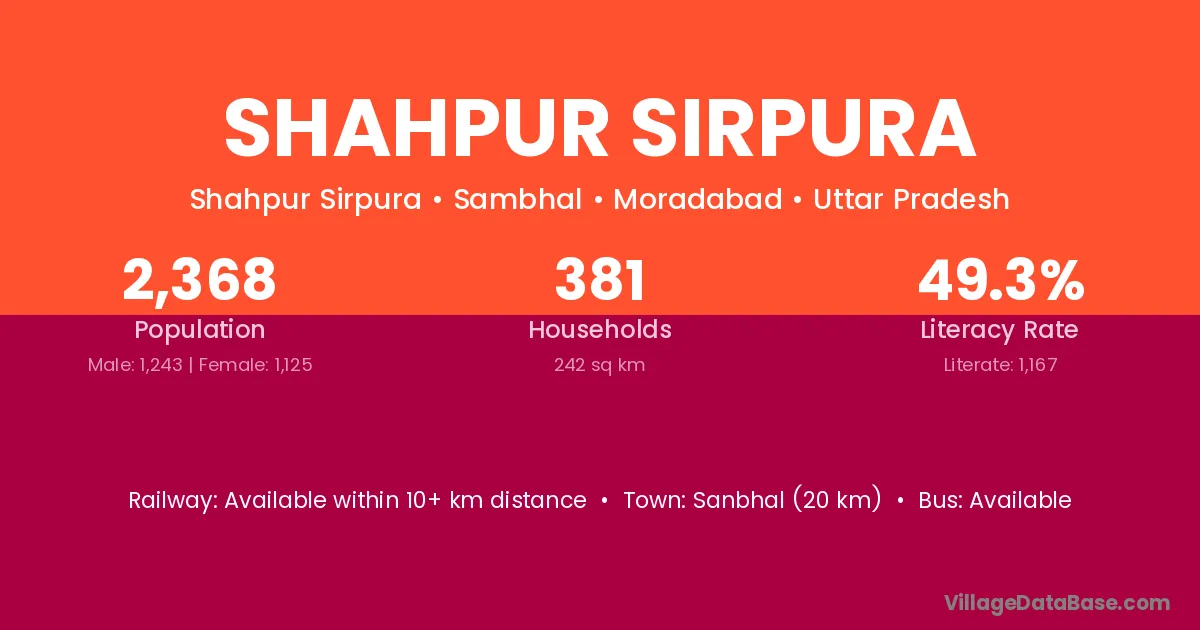 Sanbhal (20 km) is the nearest town to Shahpur Sirpura village for major economic activities and is located approximately 20 km away.