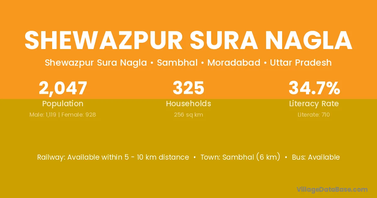 Sambhal (6 km) is the nearest town to Shewazpur Sura Nagla village for major economic activities and is located approximately 6 km away.