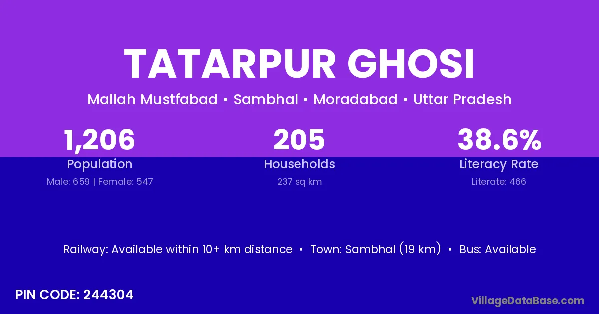 Sambhal (19 km) is the nearest town to Tatarpur Ghosi village for major economic activities and is located approximately 19 km away.