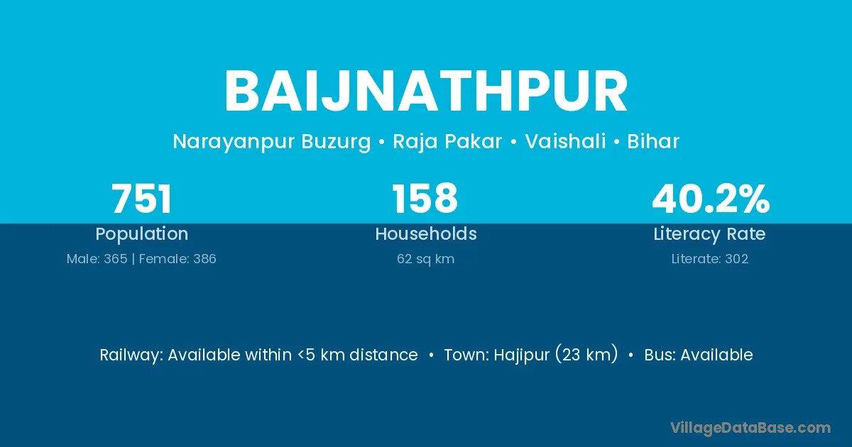 Thakurdwara (6 km) is the nearest town to Baijnathpur village for major economic activities and is located approximately 6 km away.