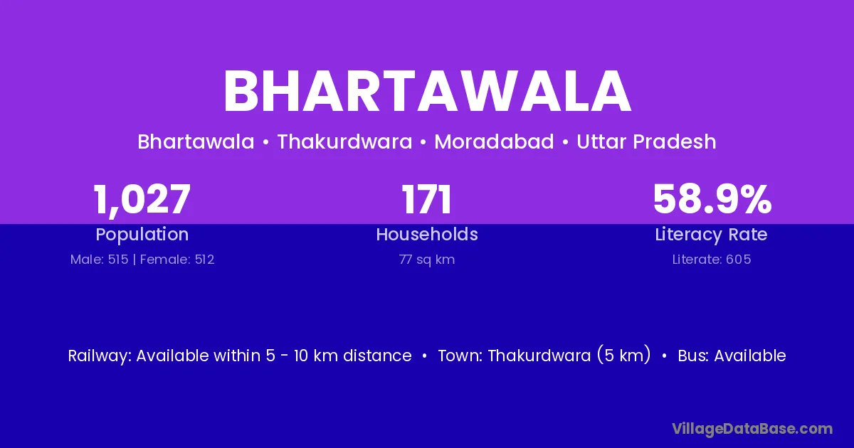 Bhartawala village has a total population of 1,027 people, of which 515 are males and 512 are females.