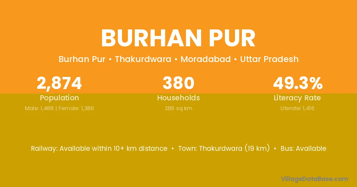 Thakurdwara (19 km) is the nearest town to Burhan Pur village for major economic activities and is located approximately 19 km away.