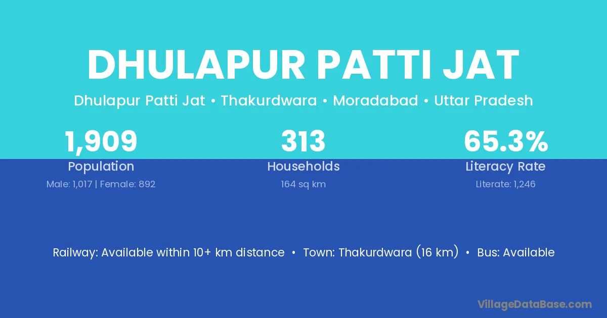 Thakurdwara (16 km) is the nearest town to Dhulapur Patti Jat village for major economic activities and is located approximately 16 km away.