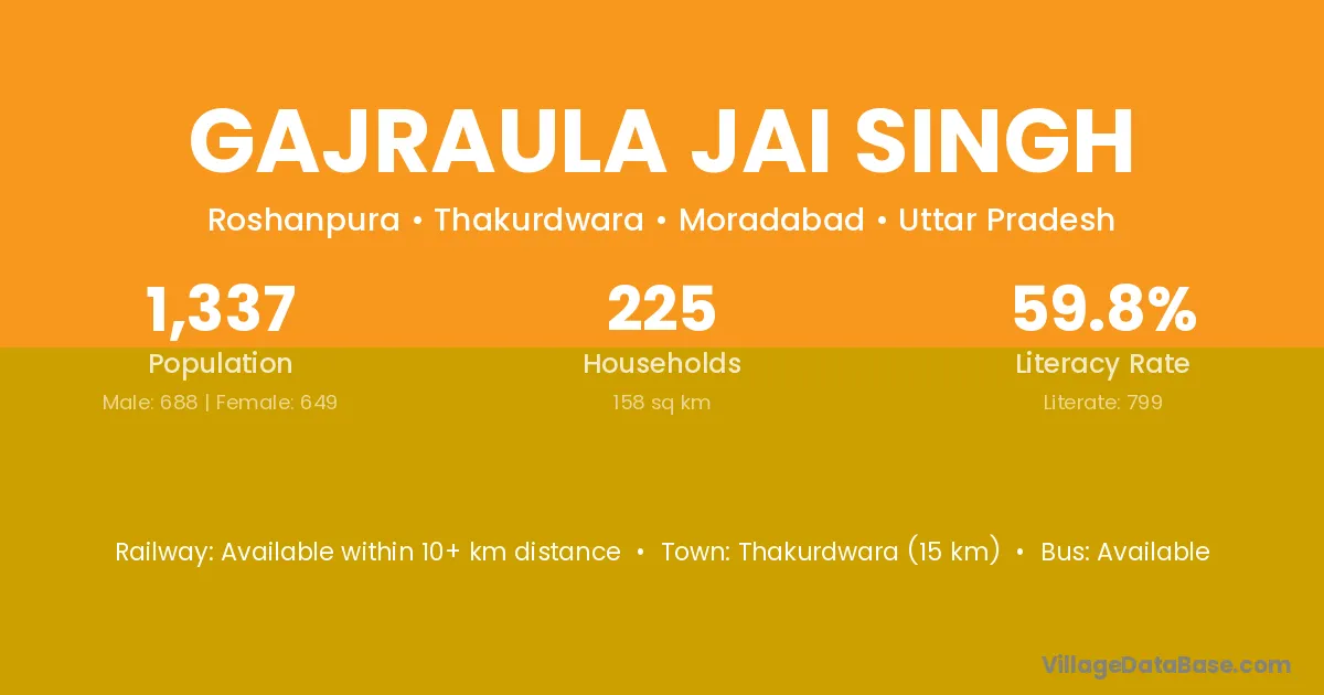 Thakurdwara (15 km) is the nearest town to Gajraula Jai Singh village for major economic activities and is located approximately 15 km away.