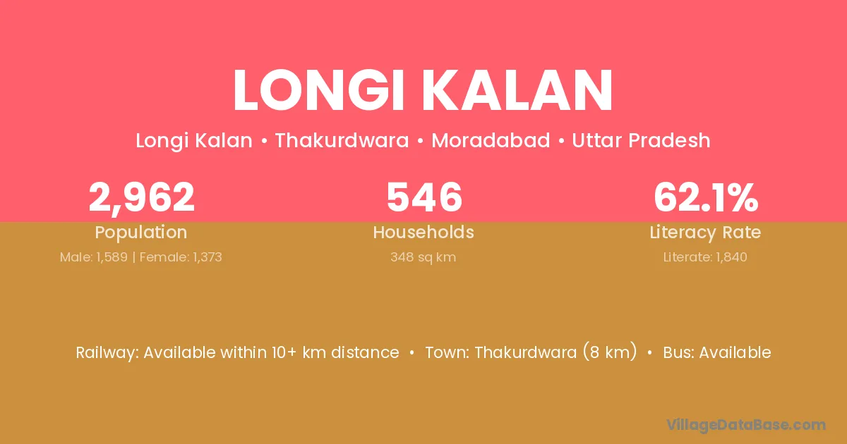 Longi Kalan village has a total population of 2,962 people, of which 1,589 are males and 1,373 are females.