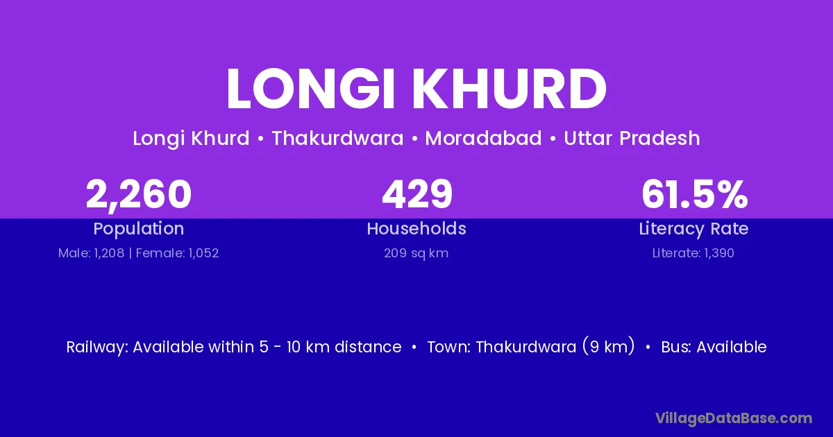 Longi Khurd village has a total population of 2,260 people, of which 1,208 are males and 1,052 are females.