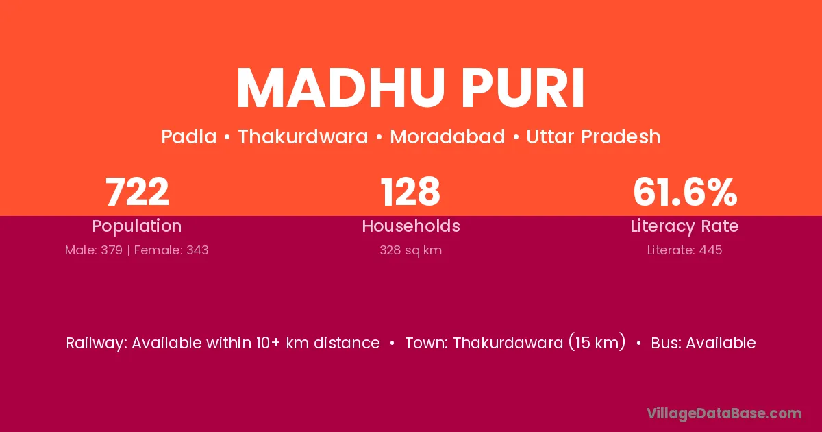 Madhu Puri village has a total population of 722 people, of which 379 are males and 343 are females.