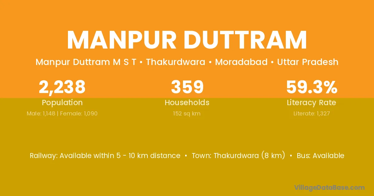 Thakurdwara (8 km) is the nearest town to Manpur Duttram village for major economic activities and is located approximately 8 km away.