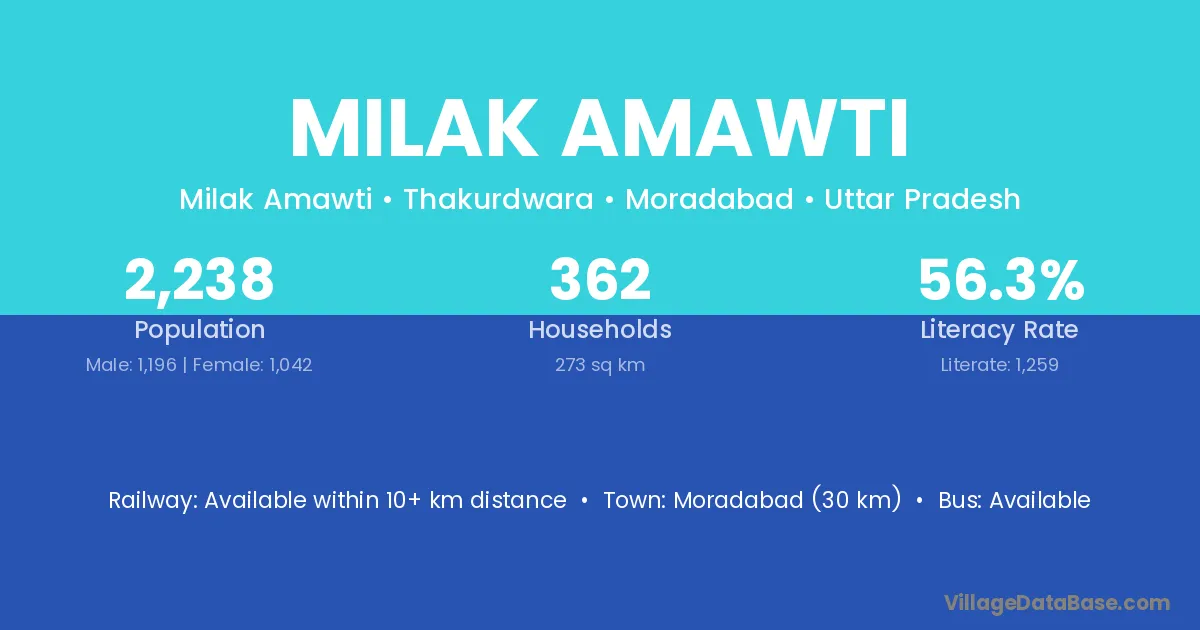 Moradabad (30 km) is the nearest town to Milak Amawti village for major economic activities and is located approximately 30 km away.