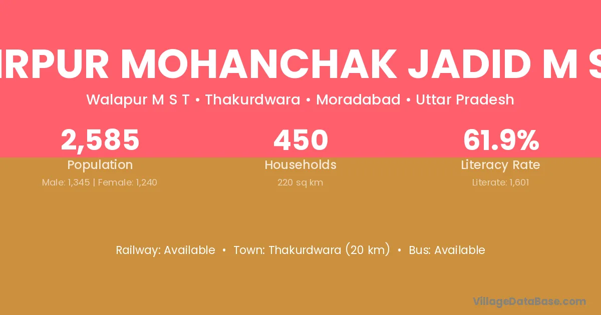 Mirpur Mohanchak Jadid M S T village has a total population of 2,585 people, of which 1,345 are males and 1,240 are females.