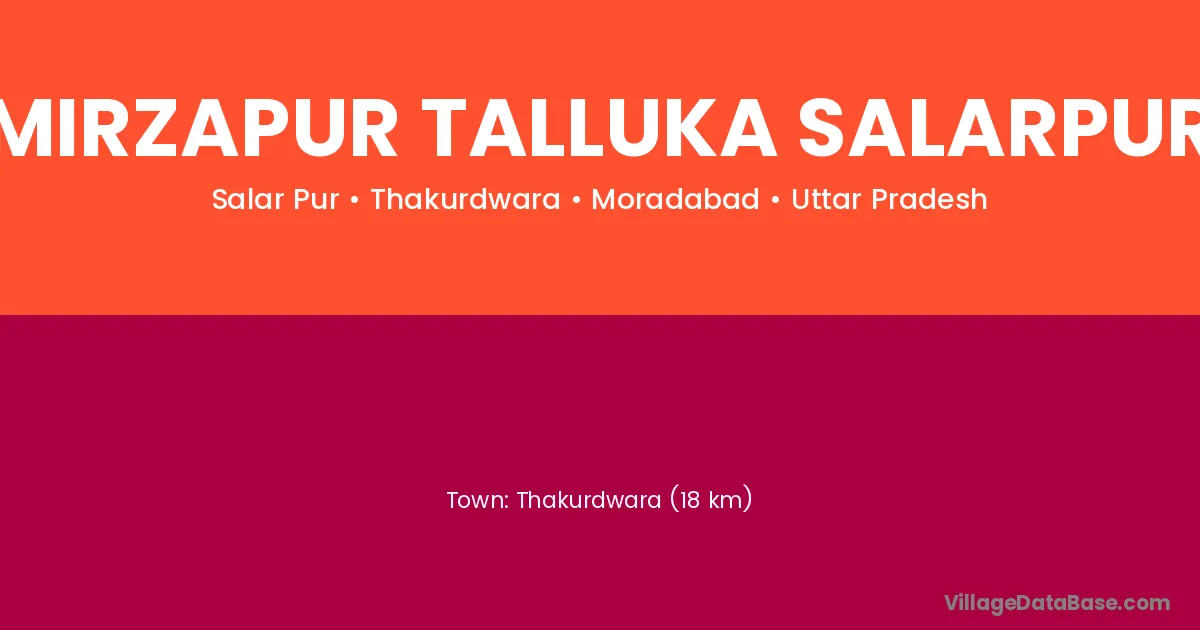 Thakurdwara (18 km) is the nearest town to Mirzapur Talluka Salarpur village for major economic activities and is located approximately 18 km away.