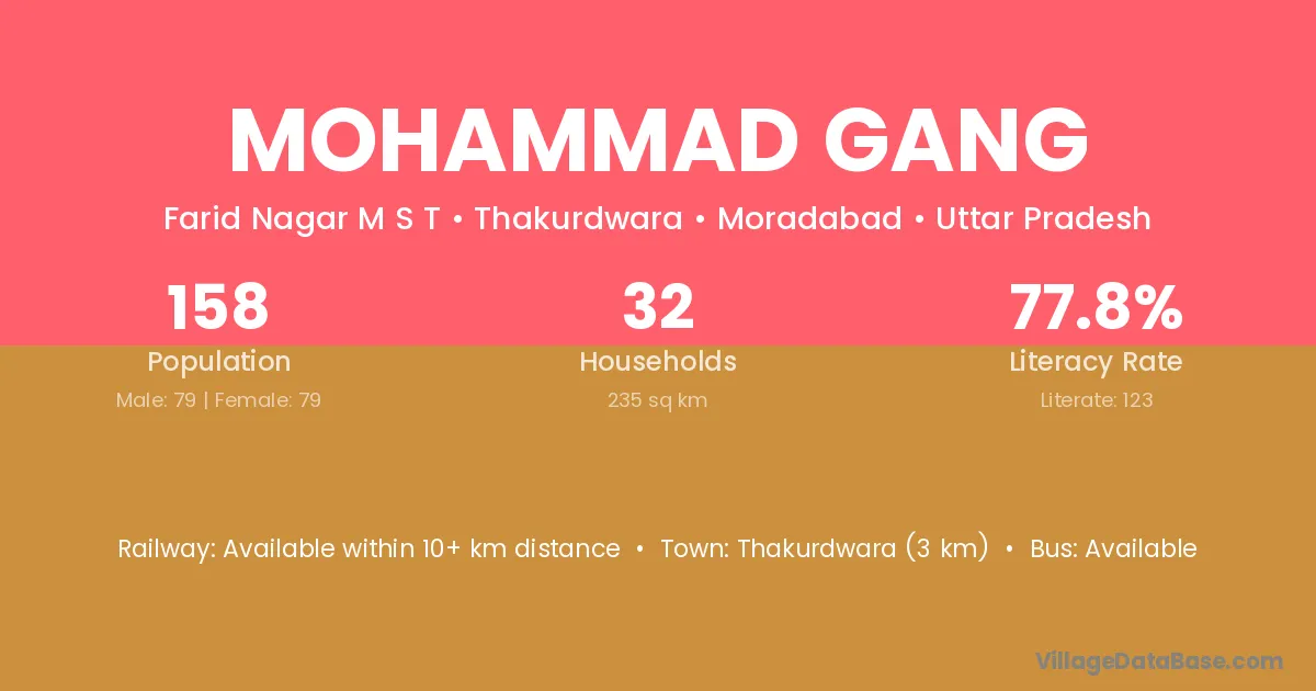 Thakurdwara (3 km) is the nearest town to Mohammad Gang village for major economic activities and is located approximately 3 km away.