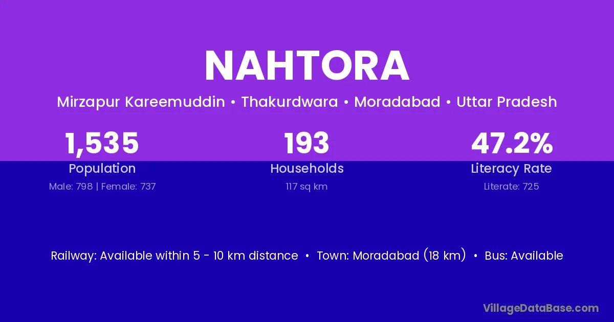 Moradabad (18 km) is the nearest town to Nahtora village for major economic activities and is located approximately 18 km away.
