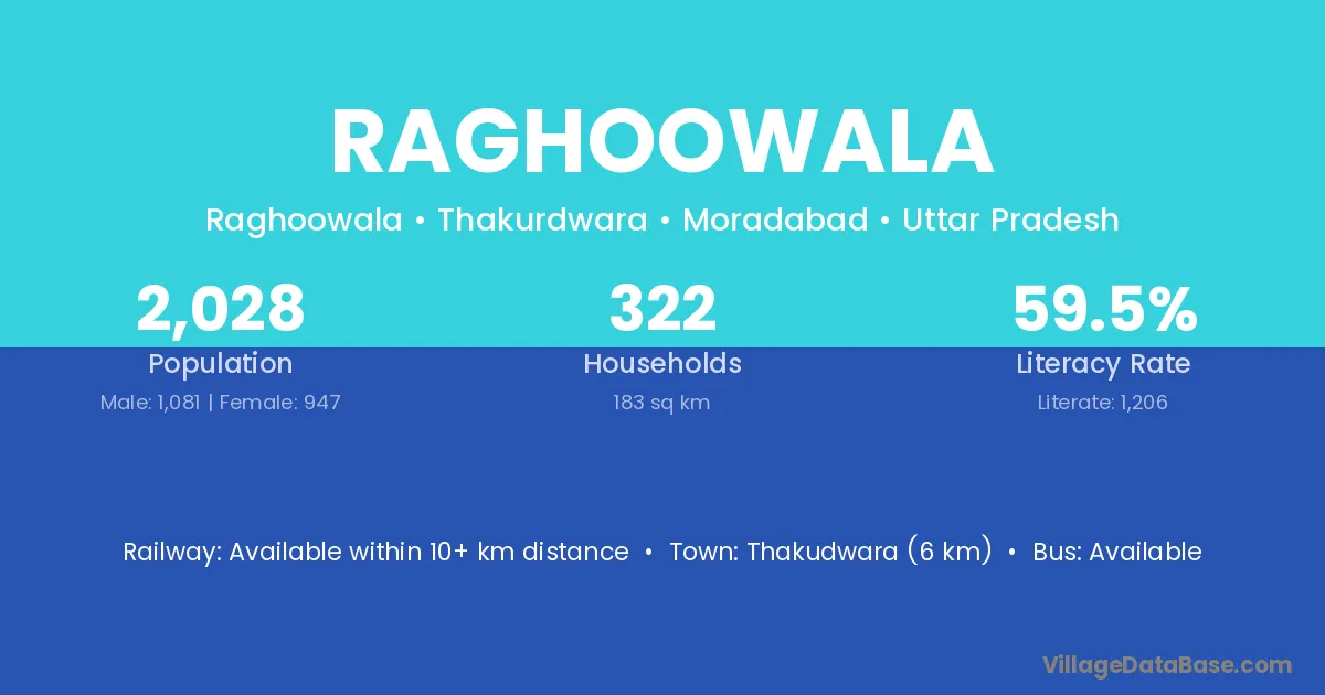 Thakudwara (6 km) is the nearest town to Raghoowala village for major economic activities and is located approximately 6 km away.