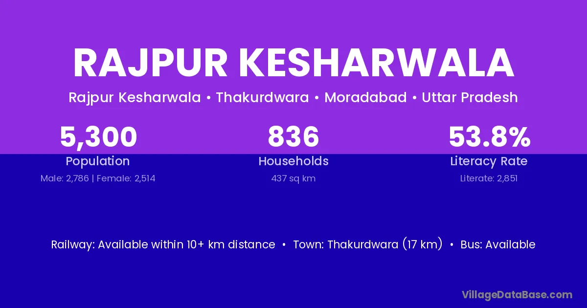 Thakurdwara (17 km) is the nearest town to Rajpur Kesharwala village for major economic activities and is located approximately 17 km away.