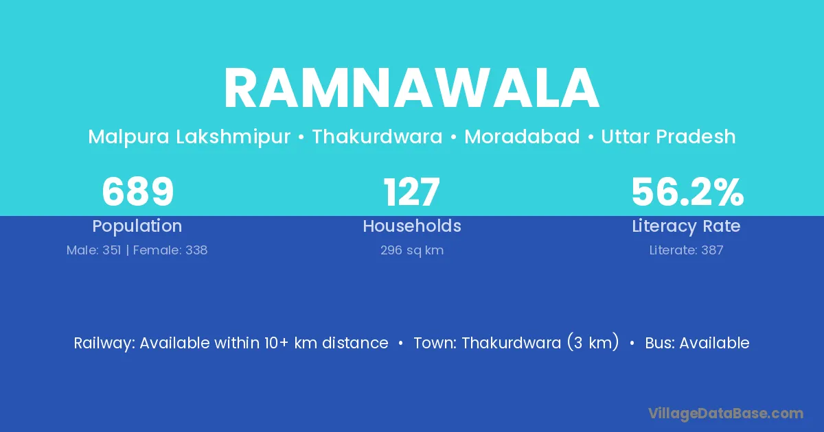 Thakurdwara (3 km) is the nearest town to Ramnawala village for major economic activities and is located approximately 3 km away.