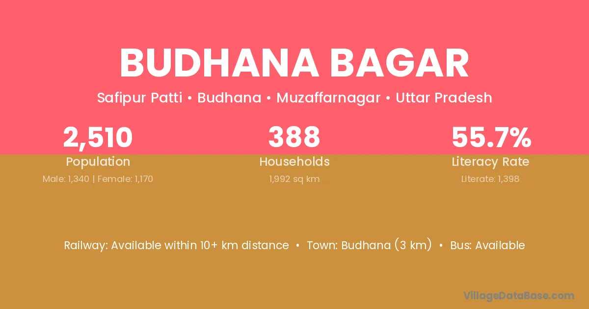 Budhana (3 km) is the nearest town to Budhana Bagar village for major economic activities and is located approximately 3 km away.