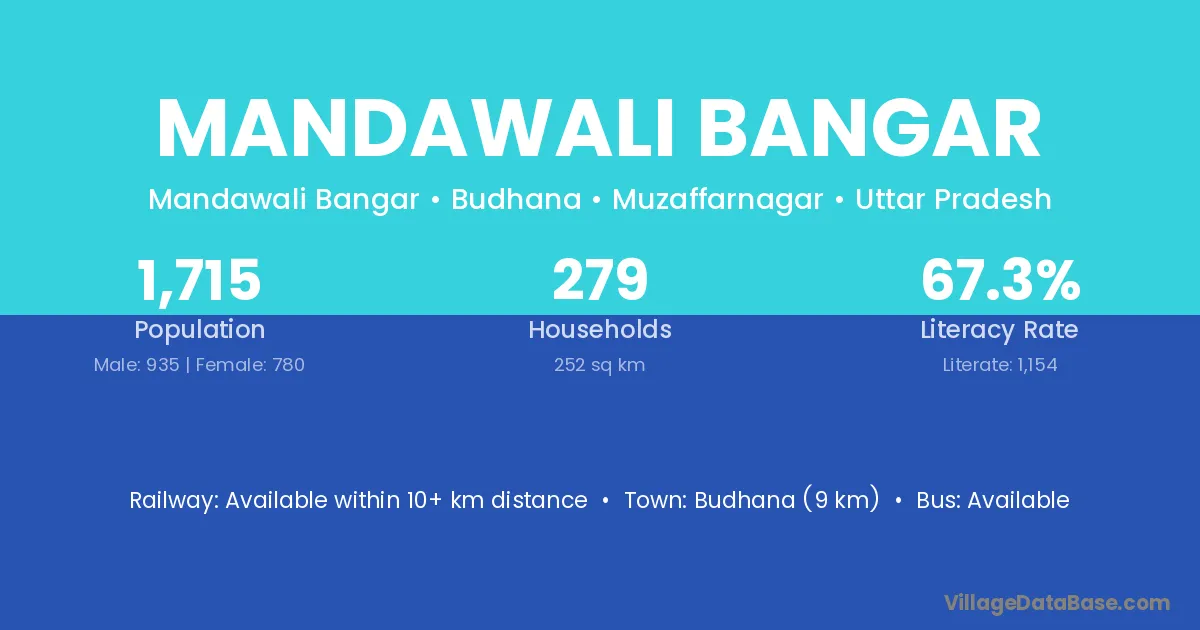 Budhana (9 km) is the nearest town to Mandawali Bangar village for major economic activities and is located approximately 9 km away.