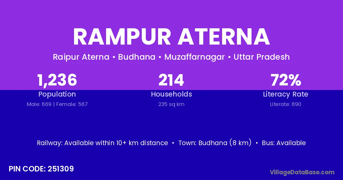 Budhana (8 km) is the nearest town to Rampur Aterna village for major economic activities and is located approximately 8 km away.