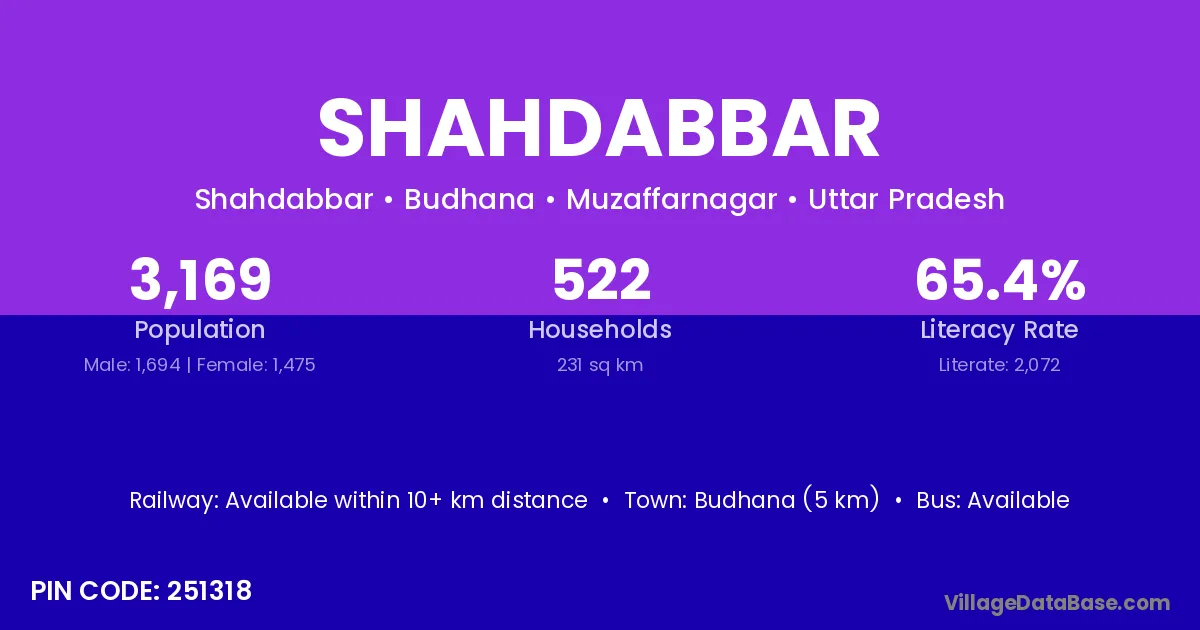 Budhana (5 km) is the nearest town to Shahdabbar village for major economic activities and is located approximately 5 km away.