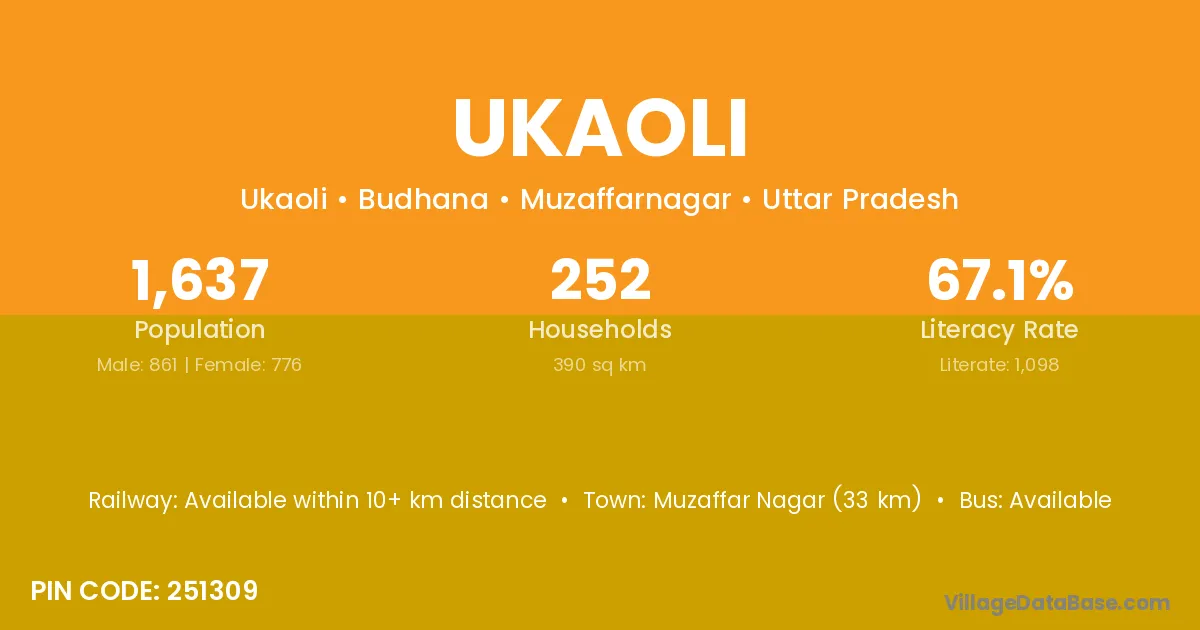 Muzaffar Nagar (33 km) is the nearest town to Ukaoli village for major economic activities and is located approximately 33 km away.