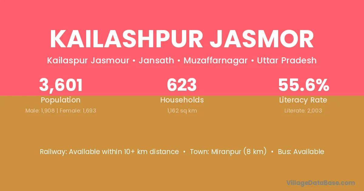 Kailashpur Jasmor village has a total population of 3,601 people, of which 1,908 are males and 1,693 are females.