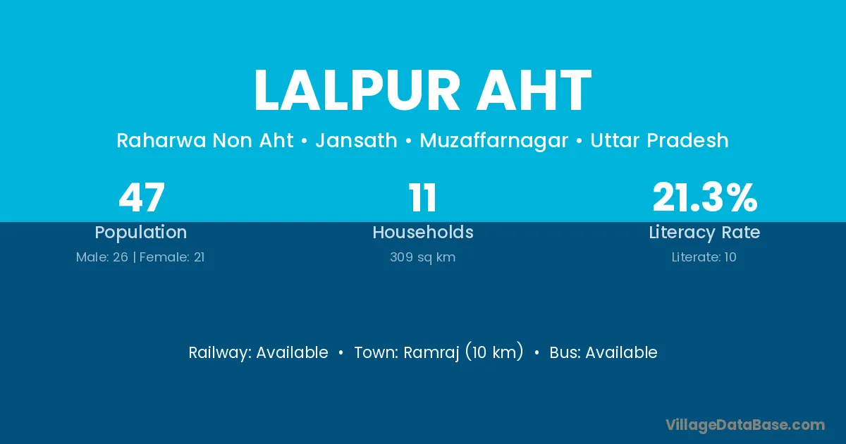 Lalpur Aht village has a total population of 47 people, of which 26 are males and 21 are females.