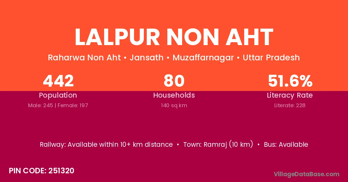 Lalpur Non Aht village has a total population of 442 people, of which 245 are males and 197 are females.
