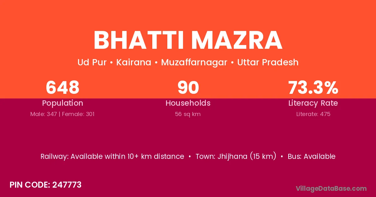Jhijhana (15 km) is the nearest town to Bhatti Mazra village for major economic activities and is located approximately 15 km away.