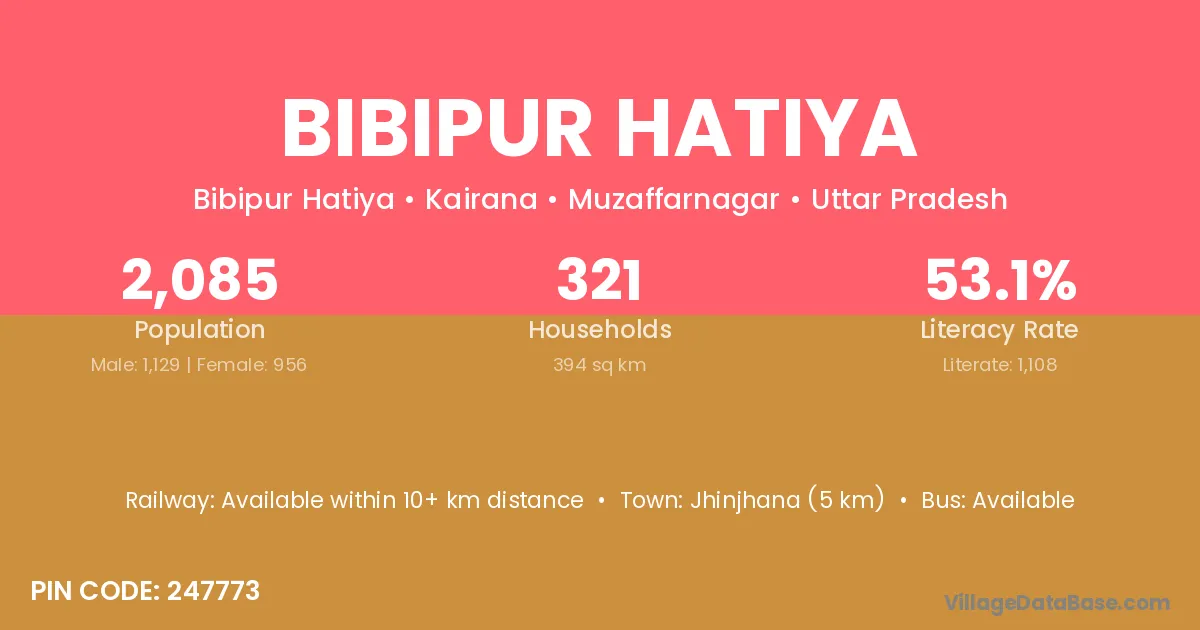 Jhinjhana (5 km) is the nearest town to Bibipur Hatiya village for major economic activities and is located approximately 5 km away.