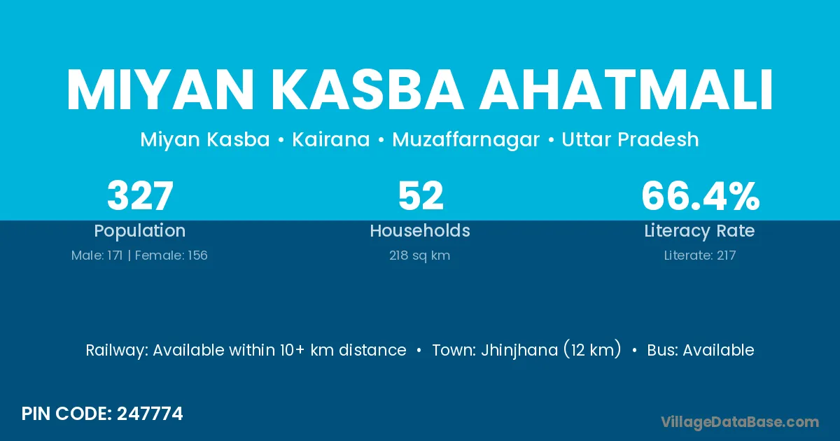 Jhinjhana (12 km) is the nearest town to Miyan Kasba Ahatmali village for major economic activities and is located approximately 12 km away.