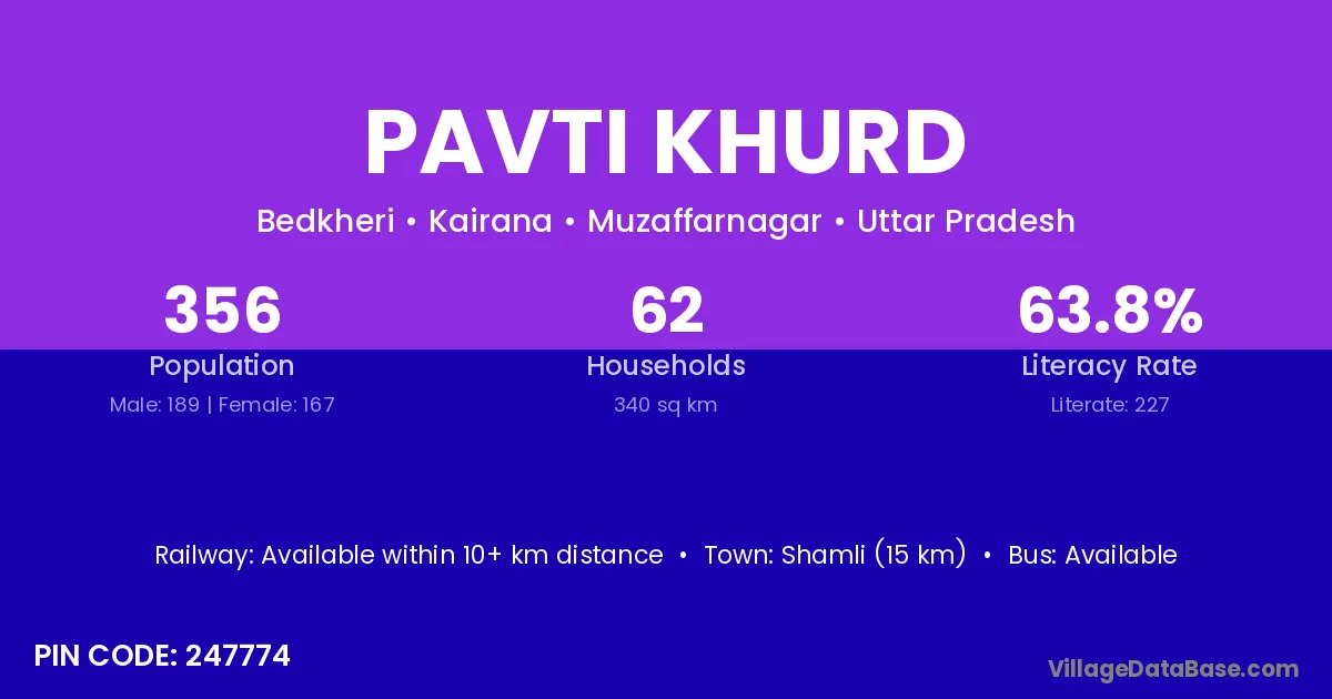Shamli (15 km) is the nearest town to Pavti Khurd village for major economic activities and is located approximately 15 km away.