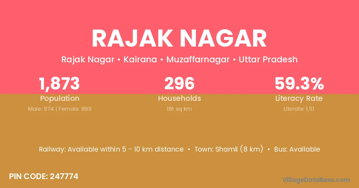 Shamli (8 km) is the nearest town to Rajak Nagar village for major economic activities and is located approximately 8 km away.